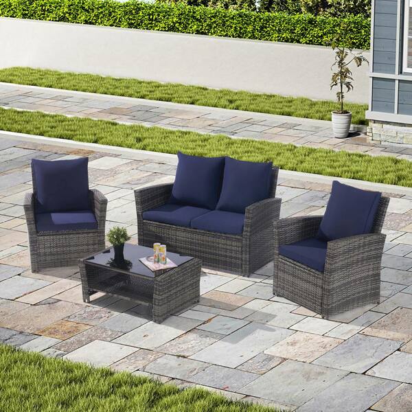 Gray 4-Piece Rattan Wicker Patio Conversation Set with Tempered Glass Coffee Table and Blue Cushions for Poolside, Lawn