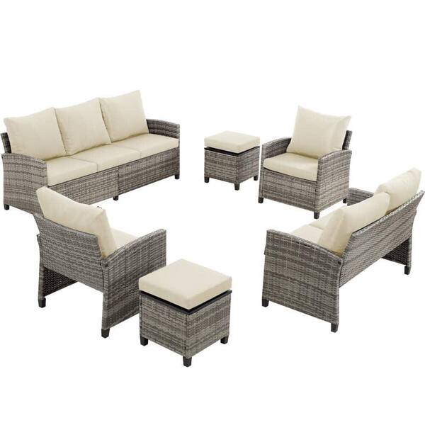 Gray 6-Piece Wicker Outdoor Patio Conversation Set with Beige Cushions and Ottomans Ottomans for Outside, Backyard
