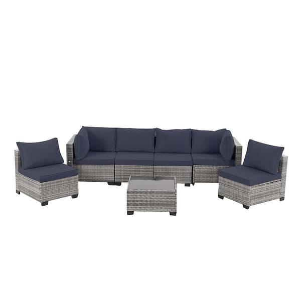 Gray 7-Piece Wicker Outdoor Patio Sectional Sofa Set with Dark Blue Cushions and Coffee Table for Garden Backyard