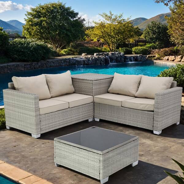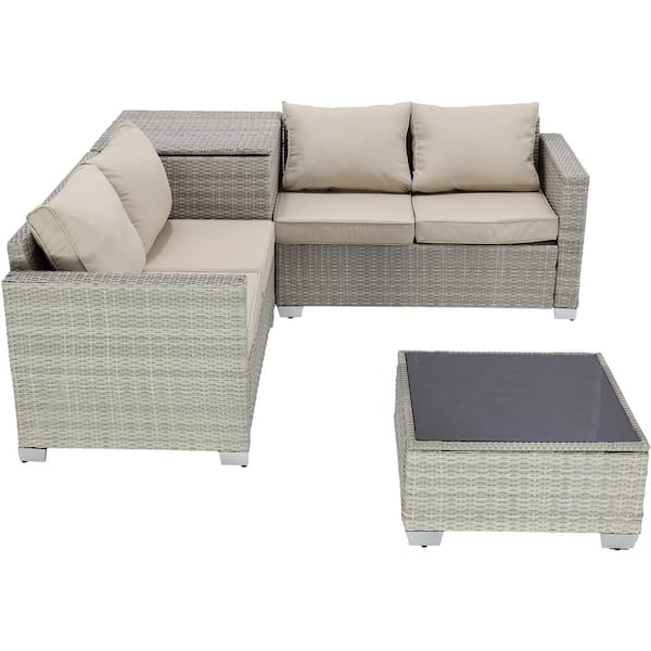 Gray White 4-Piece Wicker Patio Outdoor Sectional Sofa Set with Field gray Cushions and 1 Coffee Table
