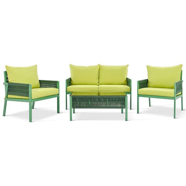 Green Metal 4-Piece Patio Conversation Set with Tempered Glass Table and Fluorescent Yellow Cushions for Backyard