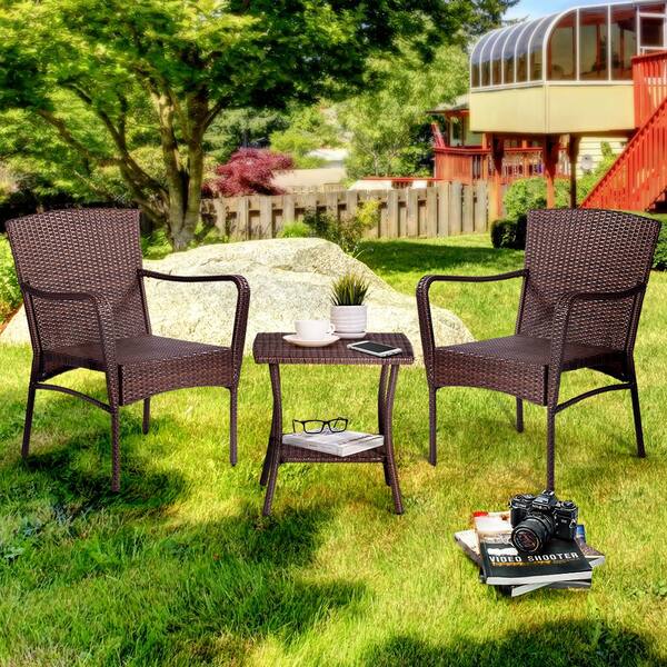 Multi-Brown 3-Piece PE Rattan Wicker Patio Conversation Set with Side Table for Backyard, Porch and Balcony