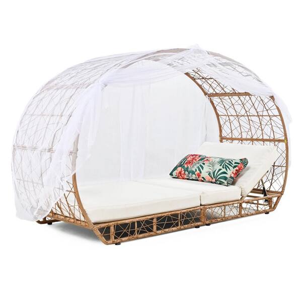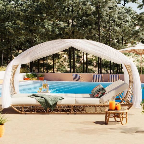 Natural Wicker Outdoor Day Bed with Beige Cushion, Curtain, Sunbed, Colorful Pillow, Adjustable Lounge Chairs Recliners