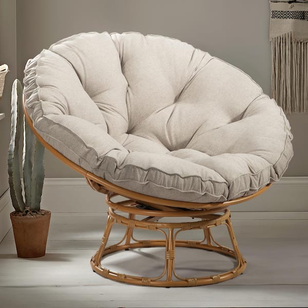 Outdoor Brown Wicker Lounge Chair 360° Swivel Base, Large Saucer Chair Egg Chair with Beige Cushion for Garden