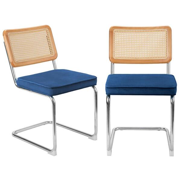 Outdoor Metal Upholstered Side Chair, Patio Modern Dining Chair with Rattan Backrest and Dark Blue Cushion, (Set of 2)