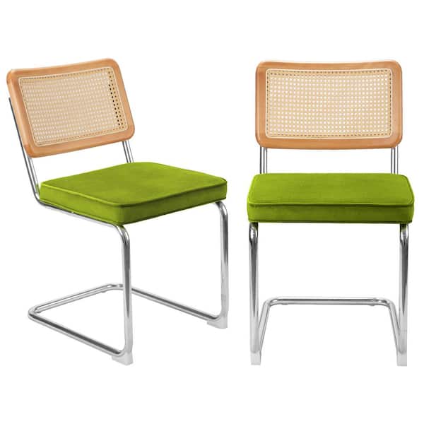 Outdoor Metal Upholstered Side Chair, Patio Modern Dining Chair with Rattan Backrest and Green Cushion, (Set of 2)