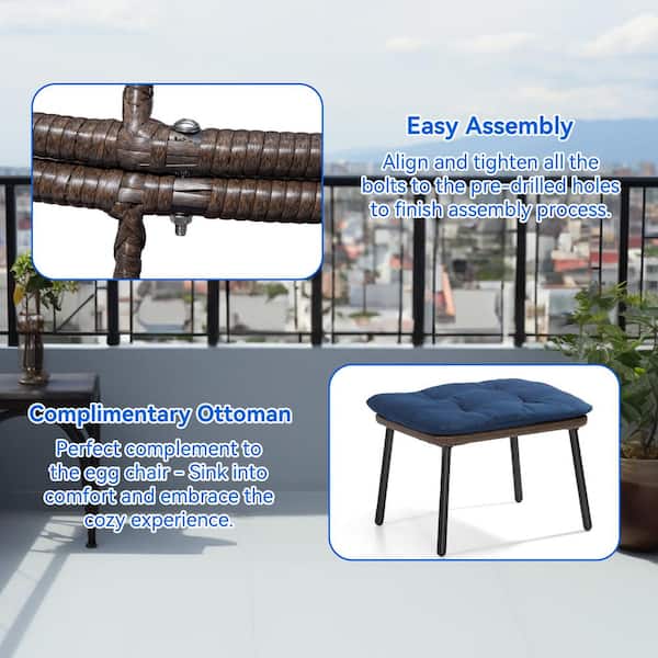Outdoor Wicker Egg Chair with Blue Cushions and Footrest