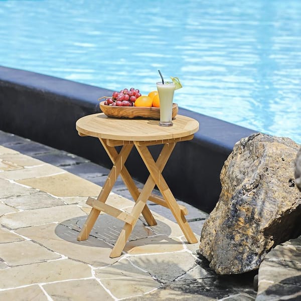 Round Teak Wood Folding Outdoor Side Table, Weather Resistant Easy Assembly Table for Backyard Garden