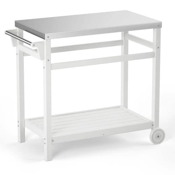 White HDPE Movable Outdoor Dining Cart Table, Grill Cart Prep Cart with Stainless Steel Tabletop