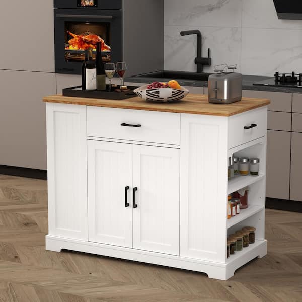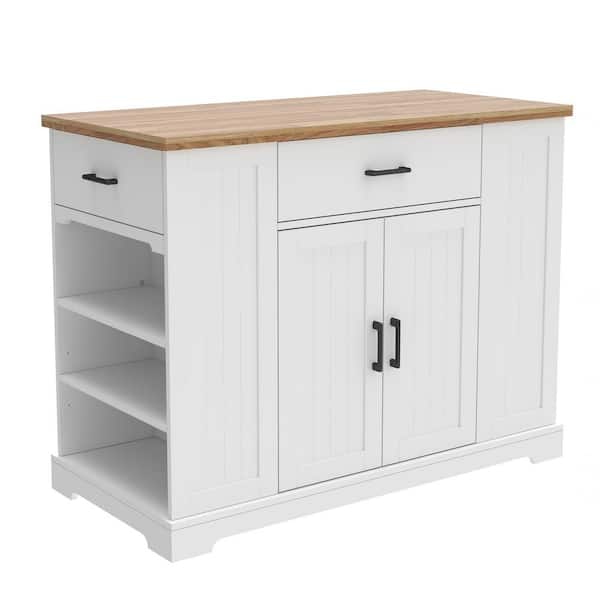White Wood 46.2 in. Farmhouse Kitchen Island with Adjustable Shelves and Three Drawers