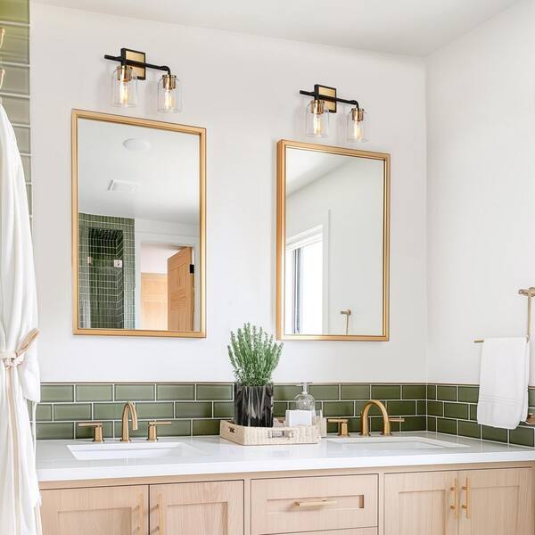 13 in. 2-Light Brass Gold Bathroom Vanity Light, Black Wall Sconce for Mirrors, Clear Glass Modern Bath Lighting