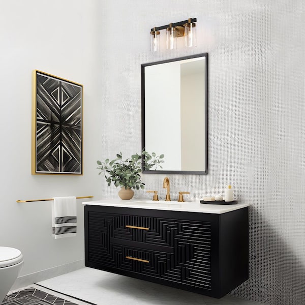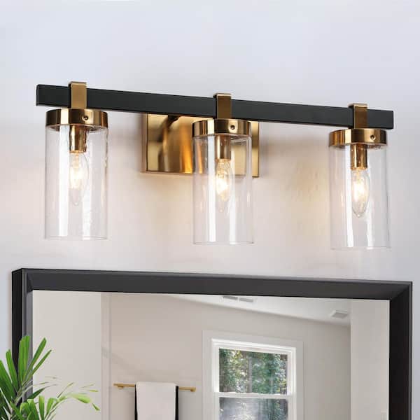 20 in. 3-Light Modern Antique Brass Bathroom Vanity Light, DIY Transitional Bath Light, Seeded Glass Black Wall Sconce