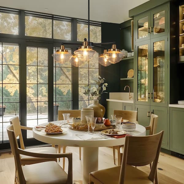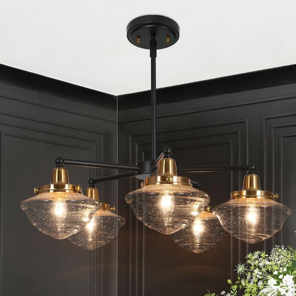 22.5 in. 5-Light Brass-Plated Round Chandelier, Seeded Glass Black Pendant Light, Modern Hanging Light Fixture