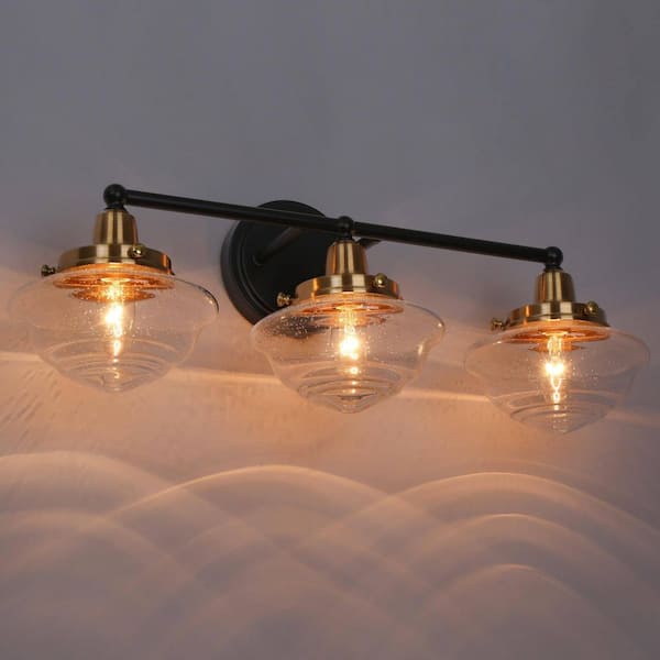 22.8 in. 3-Light Black Bathroom Vanity Light for Mirrors, Seeded Glass Bath Lighting, Industrial Brass Wall Sconce