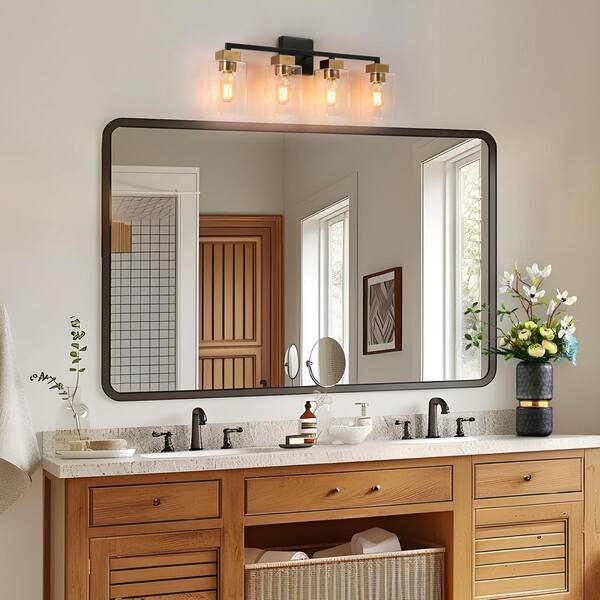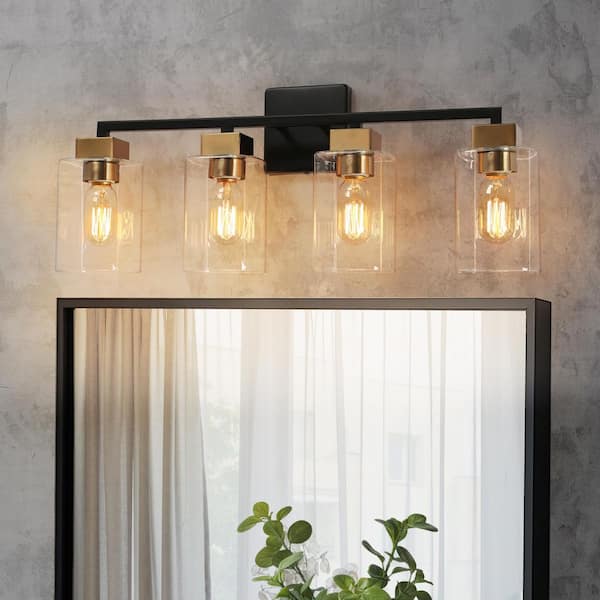 25 in. 4-Light Brass Modern Bathroom Vanity Light, Clear Glass Black Bath Lighting, Farmhouse Indoor Wall Sconce