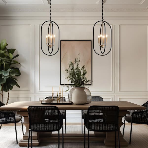 4-Light Farmhouse Lantern Dark Gold Dining Room Chandelier, Mid-Century Modern Chandelier, Black Cage Pendant Light