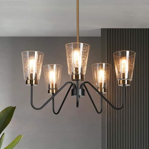 5-Light Black Island Chandelier Lighting, Seeded Glass Brass Gold Pendant Light, Modern Farmhouse Light Fixture