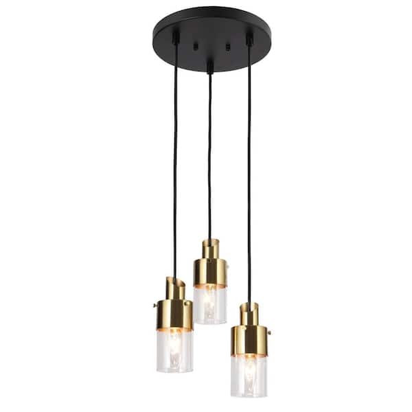 Coluse 3-Light Modern Black Chandelier, Transitional Brass Gold Adjustable Hanging Pendant with Cylinder Clear Glass