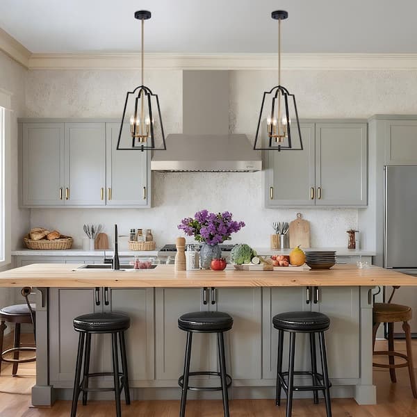 Industrial 4-Light Black Pendant Light Fixtures, Brass Pendant Hanging Light, Farmhouse Chandelier for Kitchen Island