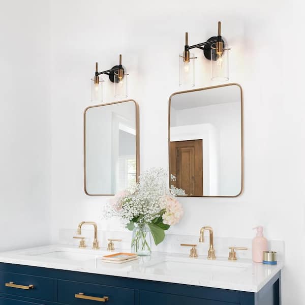 Modern 2-Light Brass Gold Bathroom Vanity Light, Black Vanity Light with Open Cylinder Clear Glass Shades Wall Light