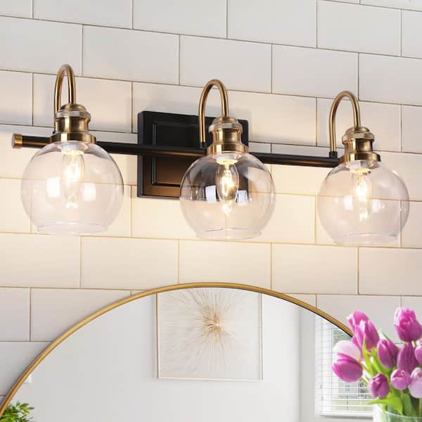 Modern 22 in. 3-Light Black Bathroom Vanity Light, Powder Room Rustic Vanity Light, Clear Glass Brass Gold Wall Light
