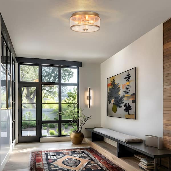 Modern 3-Light Gold Dome Flush Mount Ceiling Light for the Hallway, Bathroom Ceiling Light with Crackle Glass Shade