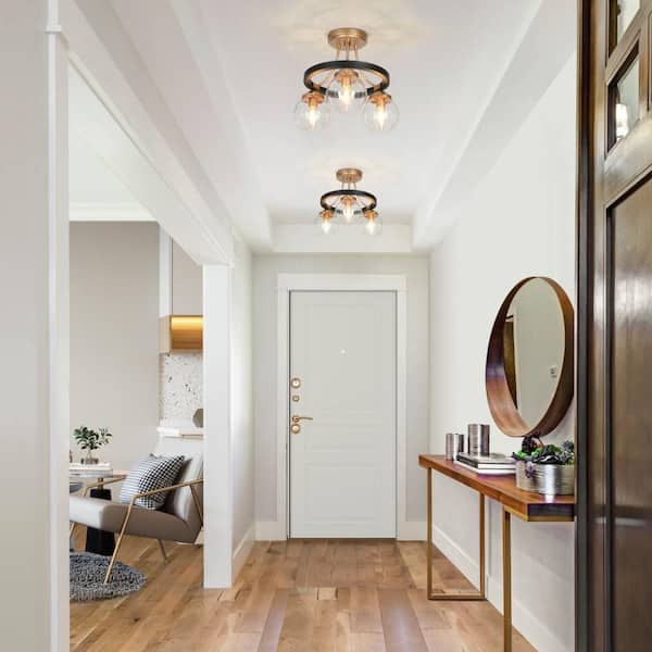 Skubnkoh Modern 14.5 in. 3-Light Black and Gold Cluster Semi-Flush Mount Ceiling Light with Globe Seeded Glass Shade