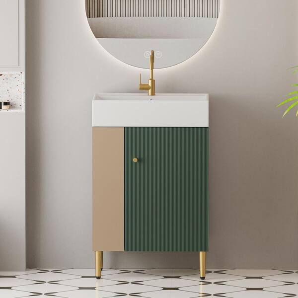 21.6 in. Single Sink Freestanding Green Bath Vanity with White Ceramic Top, Open Shelf Storage, Left Side