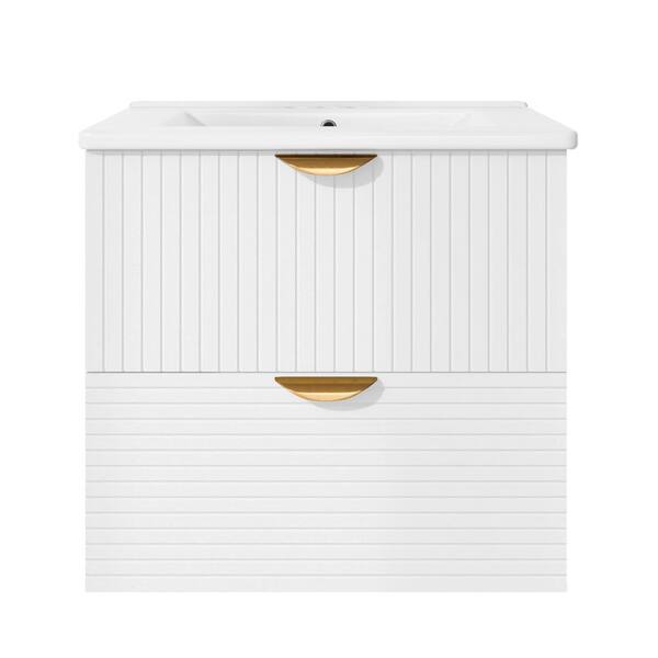 24 in. Single Sink Floating White Bath Vanity with White Ceramic Top, 2 Drawers, Gold Handles