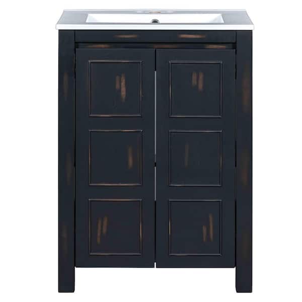 24 in. Single Sink Freestanding Black Bath Vanity with White Ceramic Top, Adjustable Shelf