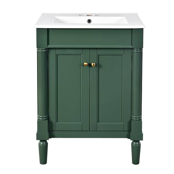 24 in. Single Sink Freestanding Green Bath Vanity with White Ceramic Top, Solid Wood Frame, Ample Storage Space