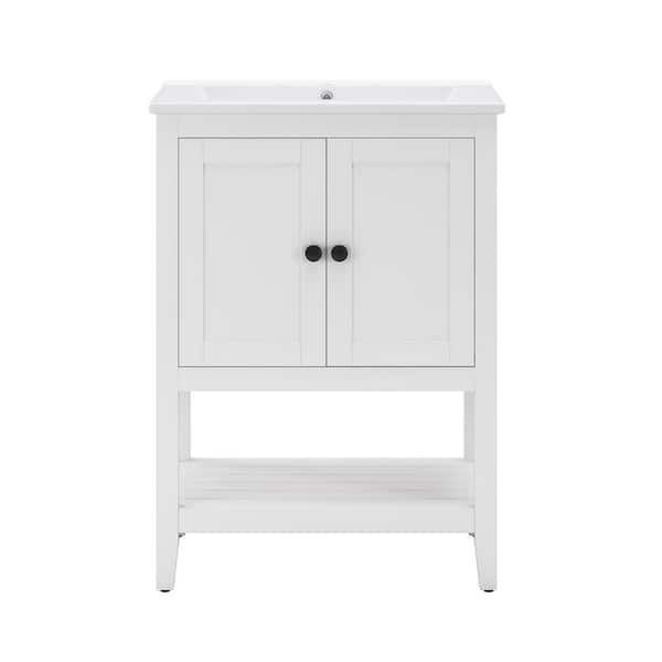 24 in. Single Sink Freestanding White Bath Vanity with White Ceramic Top, Open Shelf and 2 Doors