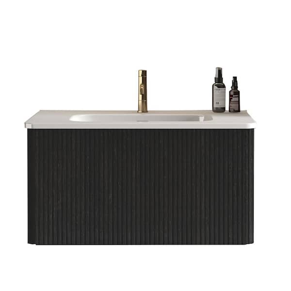30 in. Single Sink Floating Black Bath Vanity with White Ceramic Top (Assembled), Push Open Drawer
