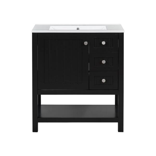 30 in. Single Sink Freestanding Black Bath Vanity with White Ceramic Top, Multifunctional Storage