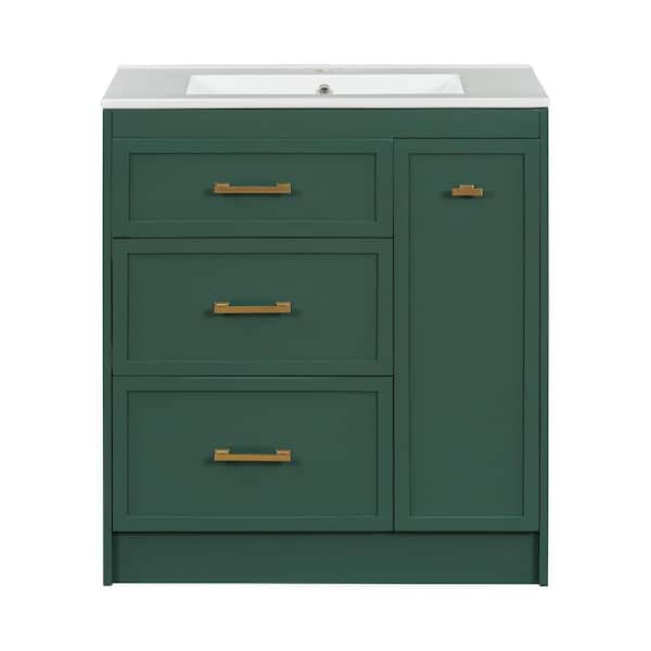 30 in. Single Sink Freestanding Green Bath Vanity with White Ceramic Top, 3 Drawers, Gold Handles