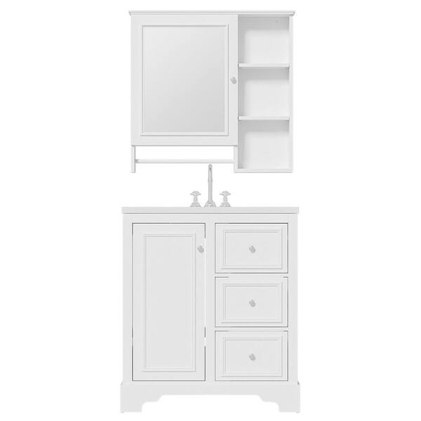 30 in. Single Sink Freestanding White Bath Vanity with White Ceramic Top and Mirror Cabinet, Adjustable Shelves