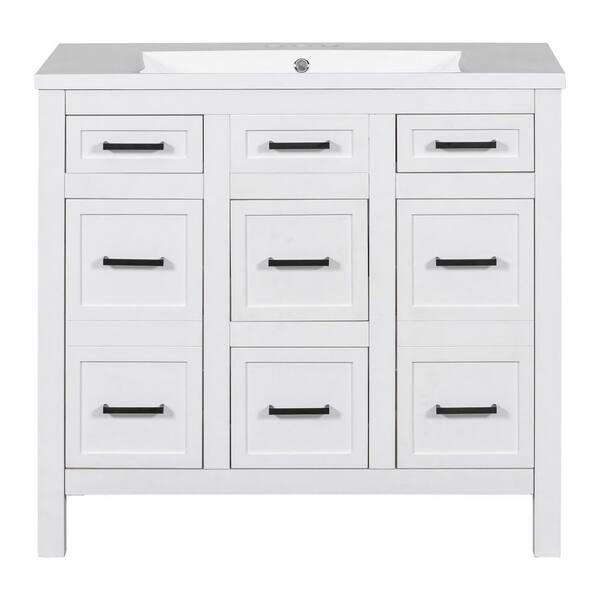 36 in. Freestanding White Bath Vanity with White Resin Top, Adjustable Shelves, Ample Storage