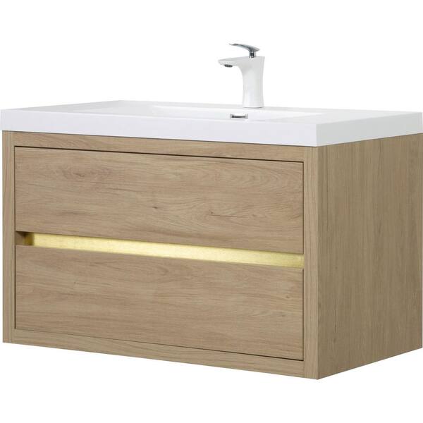 36 in. Single Sink Floating Oak Bath Vanity with White Resin Top (Assembled), Stone Resin Countertop, Water-Resistant