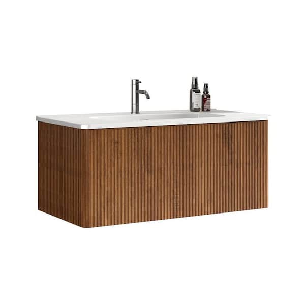 36 in. Single Sink Floating Walnut Bath Vanity with White Ceramic Top (Assembled), Curved Edges, Striped Texture