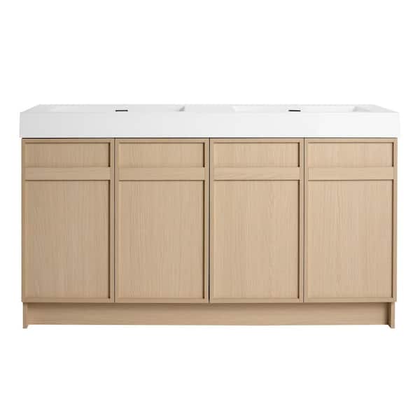 60 in. Double Sink Freestanding Oak Bath Vanity with White Resin Top, Adjustable Shelf, 4 Soft-Close Cabinet Doors