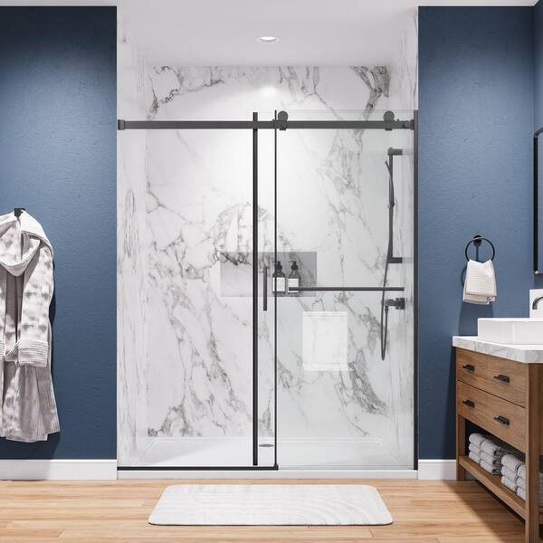 60 in. W x 72 in. H Exposed Roller Sliding Frame Shower Door in Black with 5/16 in. Clear Glass