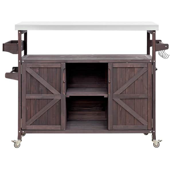 Outdoor Brown Stainless Steel Top 50 in. Kitchen Island Cart with 4 Hook Hanger, Bottle Opener, Spice Rack and Wheels