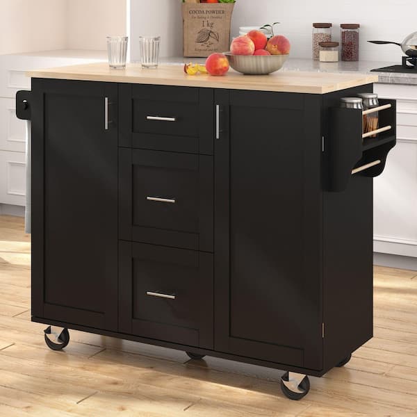Rolling Black Drop Leaf Wood Top 50 in. Kitchen Island Cart with Internal Storage Racks, Adjustable Shelf, 5 Wheels
