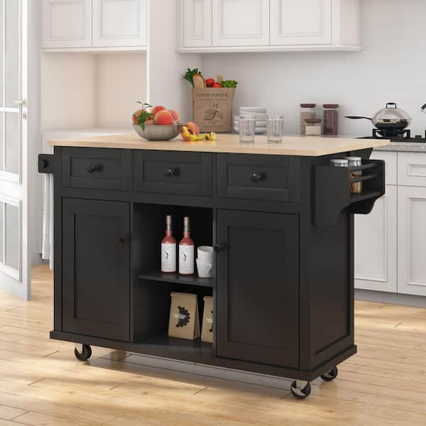 Rolling Black Drop Leaf Wood Top 53 in. Kitchen Island Cart with Storage Racks, Removable Shelves, 5 Wheels
