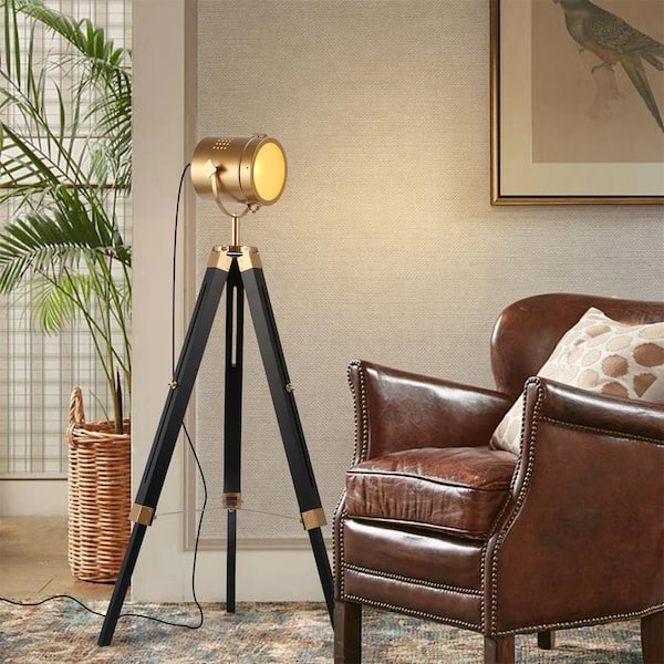 55 in. 1-Light Black Adjustable Height Tripod Floor Lamp for Living Room with Gold Rotatable Shade and Foot Switch