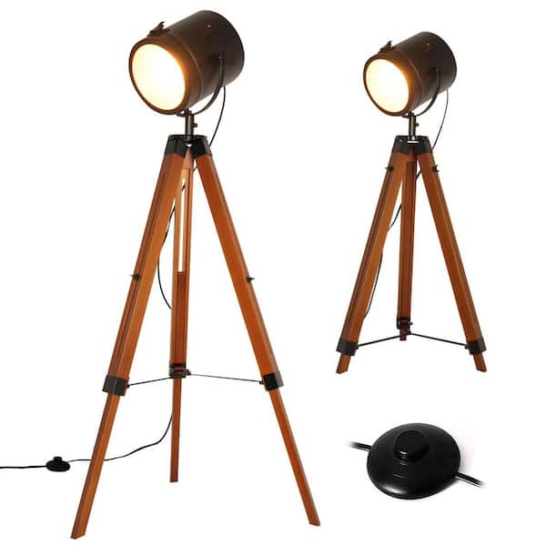 55 in. 1-Light Black Wood Adjustable Height Tripod Floor Lamp for Living Room with Round Rotatable Shade and Foot Switch