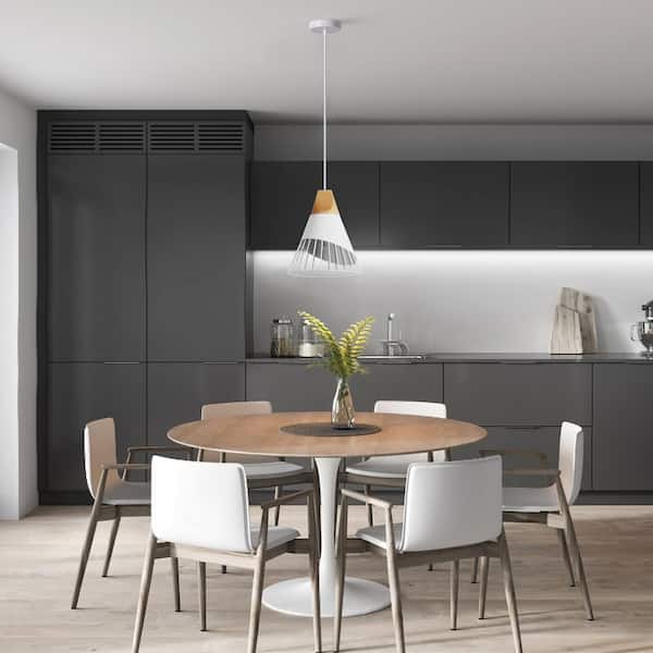 9.4 in. 1-Light Badminton Dome Pendant Light with White Cage Shade, Industrial Adjustable Height Wood Chandelier