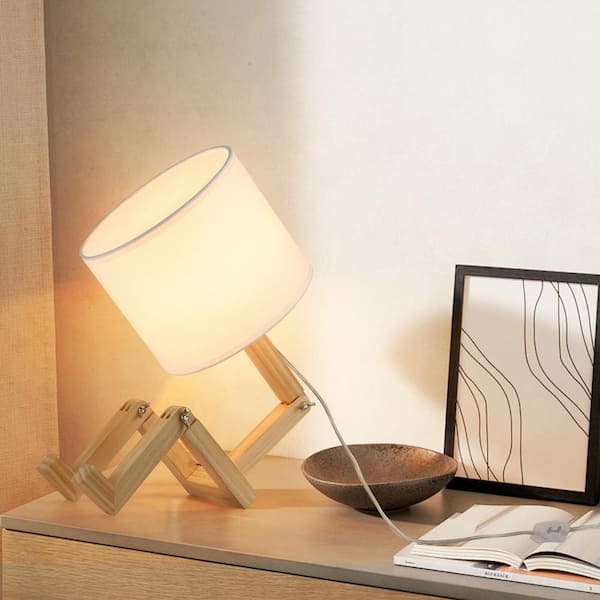 Industrial 18 in. 1-Light Foldable White Wood Table Lamp for Living Room with Farbic Shade, E26 Base, not Include Blub