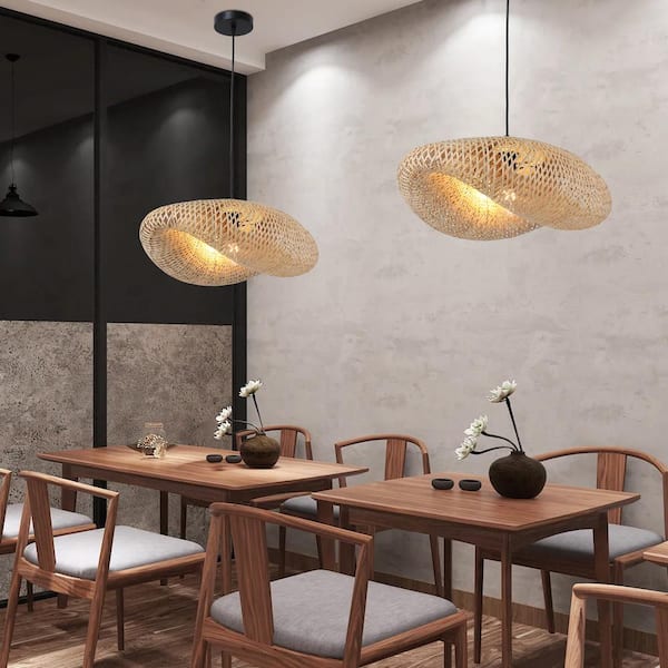 Industrial 23.64 in. 1-Light Large Chandelier Pendant Light with Bamboo Shade, Adjustable Height