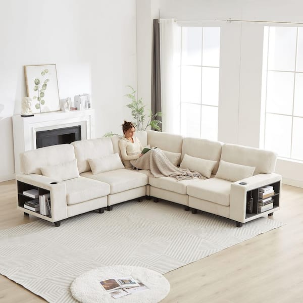 102.75 x 102.75 in. L-Shaped Modular Corduroy 5-Seat Convertible Sectional Sofa in Beige with Arm Storage, Cup Holder